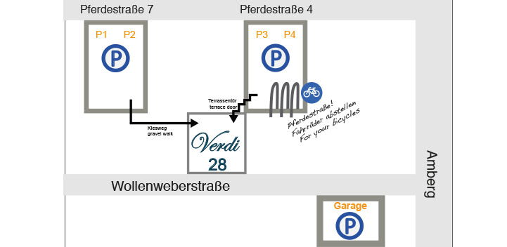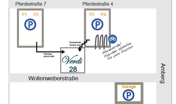 - Es gibt 3 Parktaschen in der Garage direkt gegenüber dem Hotelhaupteingang in der Wollenweberstraße / Ecke „Amberg“