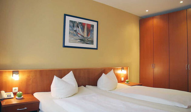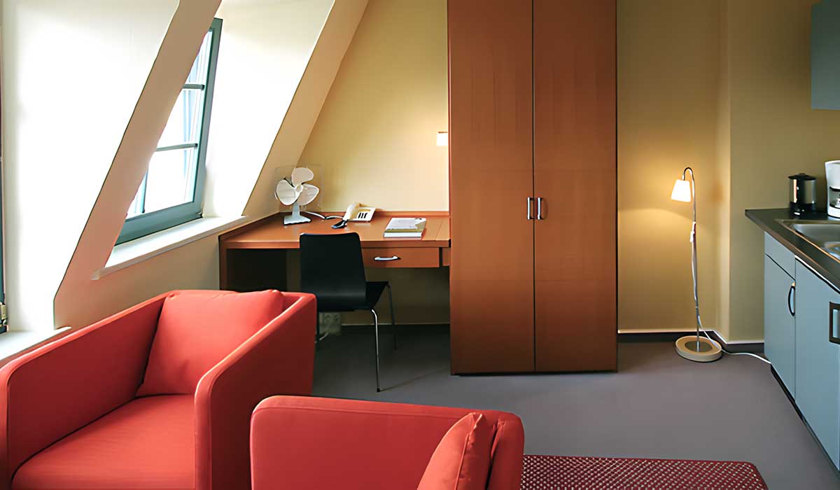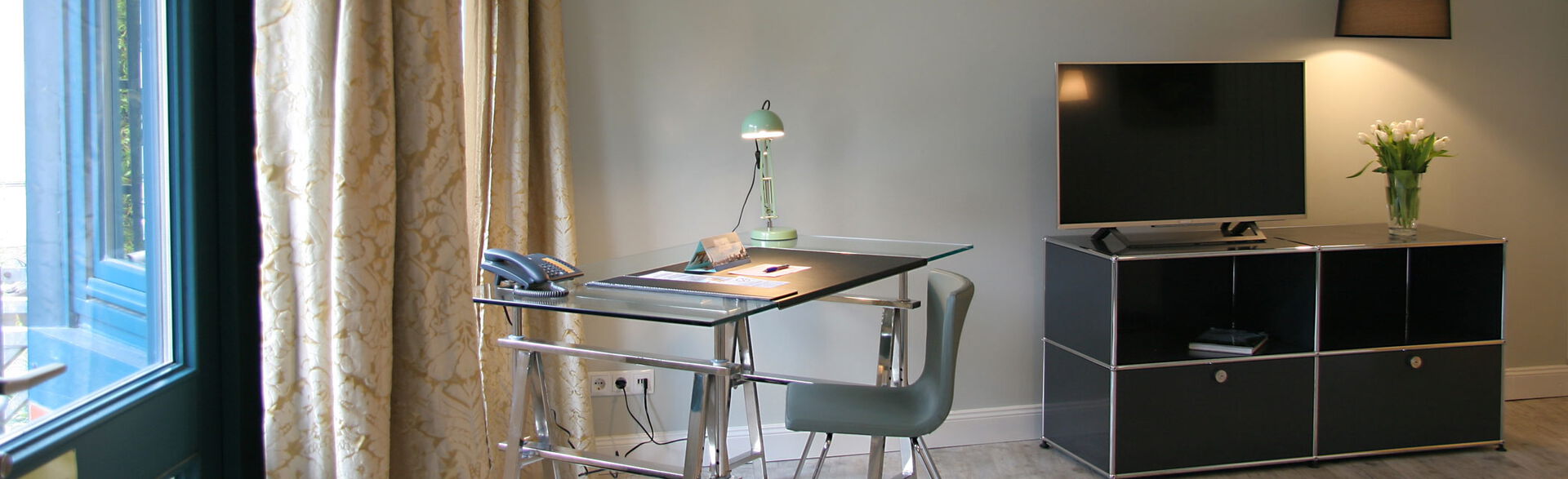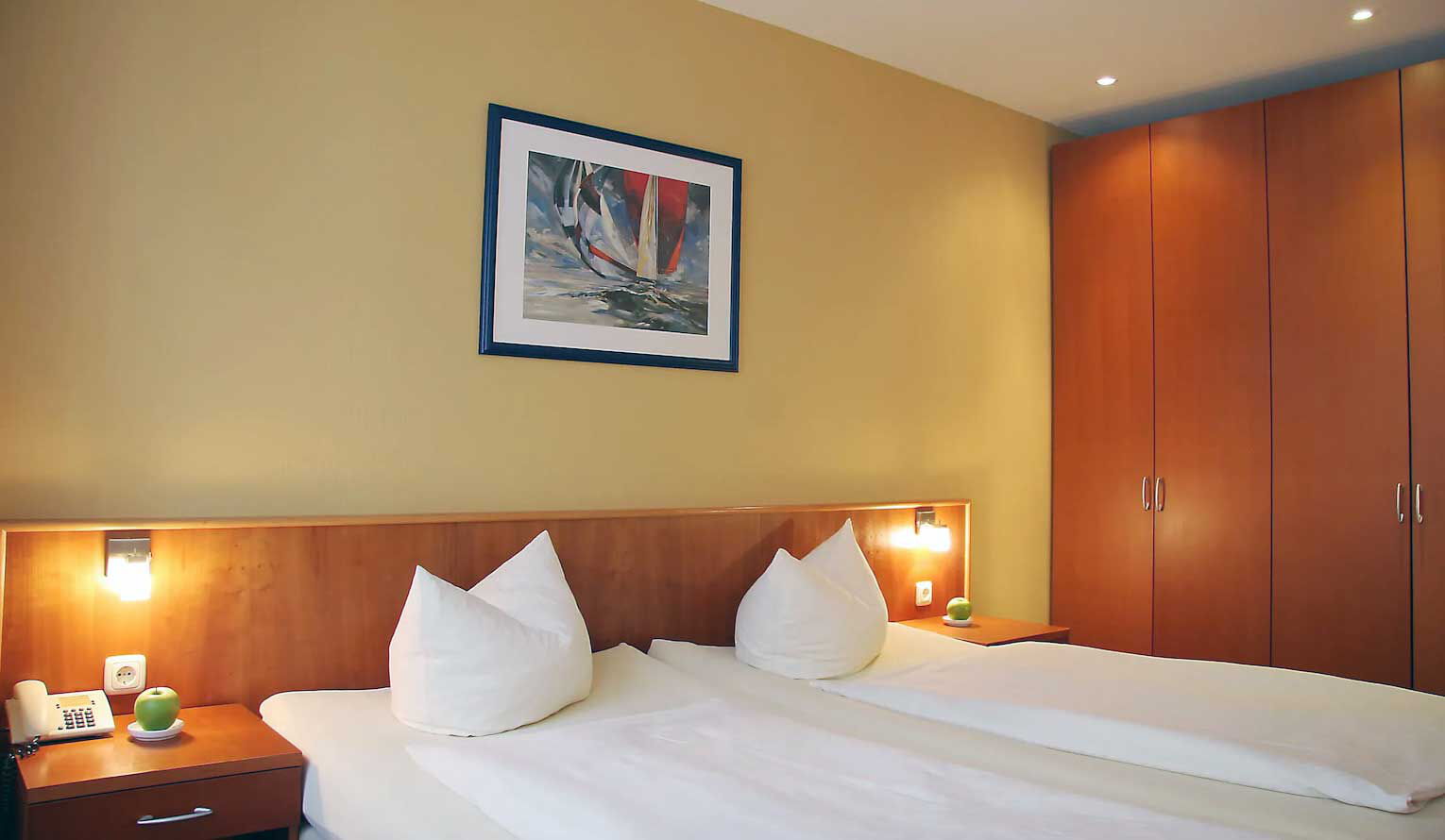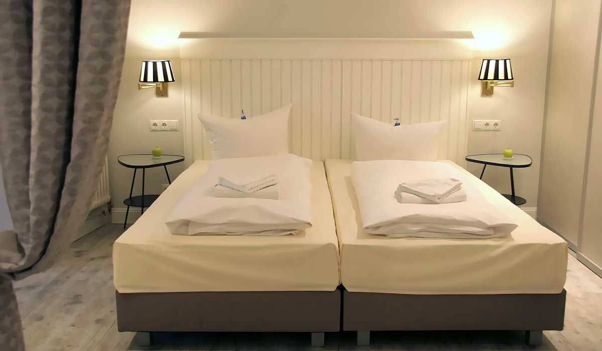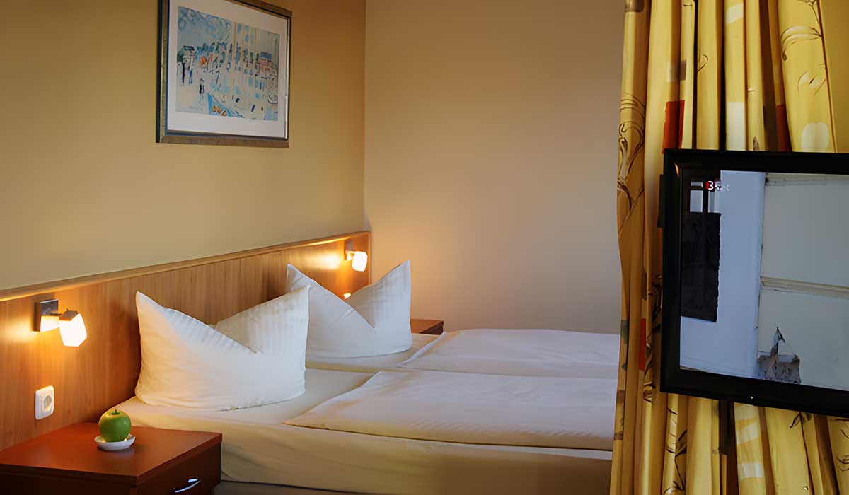4 Einzelzimmer können von Ihnen insgesamt gebucht werden. In der 1. und 2. Etage sind jeweils zwei, einmal zum Hof in der Pferdestraße und zwei zur Wollenweberstraße. Im Bad haben Sie Dusche, WC und einen leistungsstarken Fön! Die Sony Flatscreen TVs bieten Ihnen ein kontrastreiches Fernsehbild. Sie wählen das Programm! Getränke stehen Ihnen in der Minibar zur Verfügung.