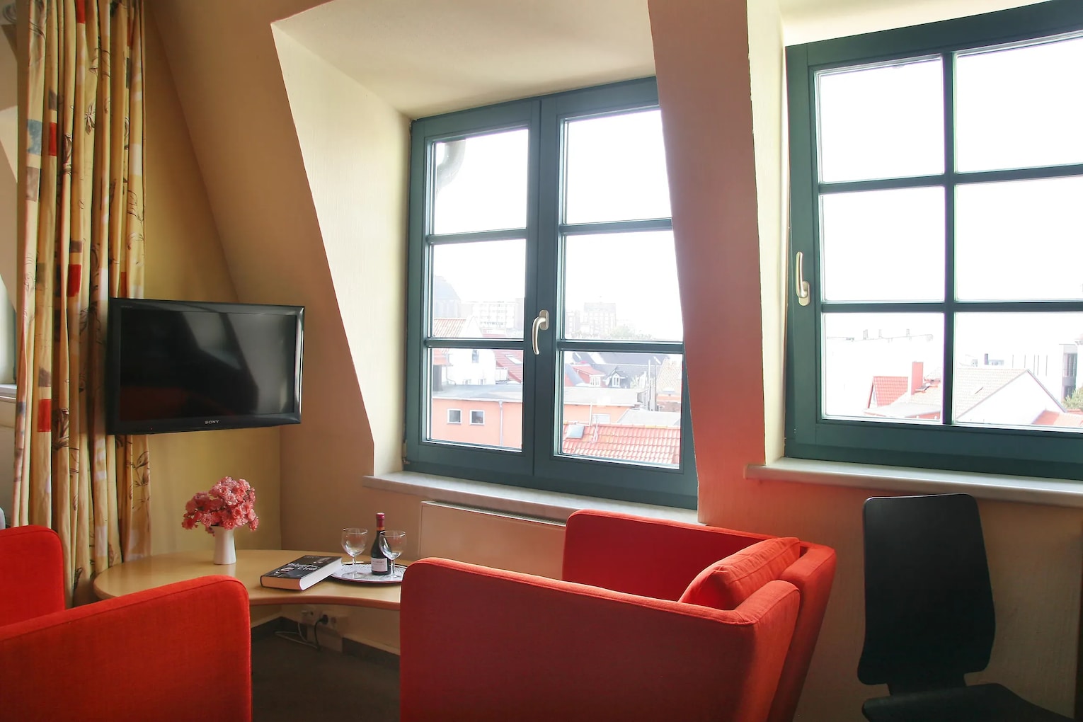 Jeweils zwei Standard-Doppelzimmer befinden sich in der 1. und 2. Etage. Zwei zum Hof in der Pferdestraße und zwei zur Wollenweberstraße. Im Bad haben Sie Dusche, WC und einen leistungsstarken Fön! Flatscreen TV von Sony, damit Sie den Abend bei einem scharfen Fernsehfilm ausklingen lassen können;-) Gekühlte Getränke stehen für Sie in der Minibar bereit.